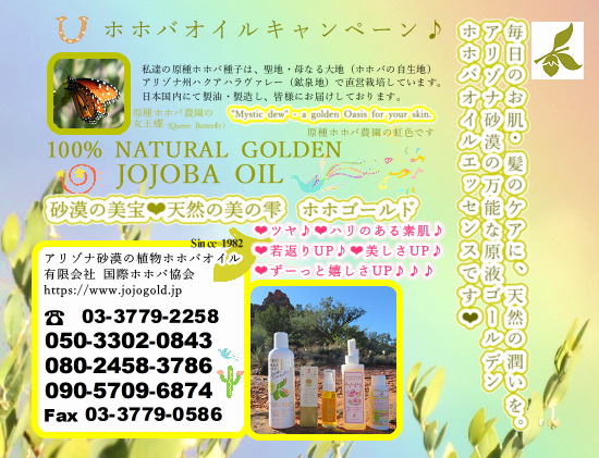 ♔ 私達のホホバオイルは、ハリウッドスターも内密で通ったと云われる温泉水・アクアカリエンテの美のマジック鉱泉で潤った高品質を誇るアリゾナ州原産砂漠の神秘の植物原種のゴールデンホホバオイルです。原種ホホバの聖地政府の環境保護区域側のイーグルテール山の麓でアリゾナ州原産の原種ホホバ(純粋種Sayuri原種ホホバ)が生長しています。『ホホゴールド』は、自然の恵みをたっぷり含み、優れた浸透力によってお肌の内側に作用します。ツヤ、ハリのある素肌本来の美しさへ。